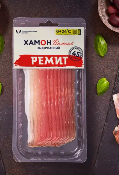Компания «РЕМИТ» производит два наиболее популярных вида ветчины: «Шале» и ветчину из окорока в натуральной оболочке. Оба сорта изготавливаются из отборной российской свинины с добавлением оригинального букета натуральных специй.
