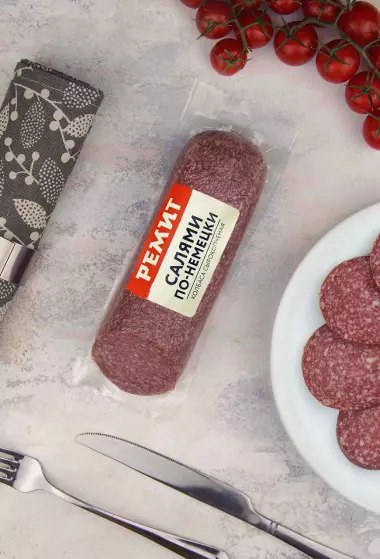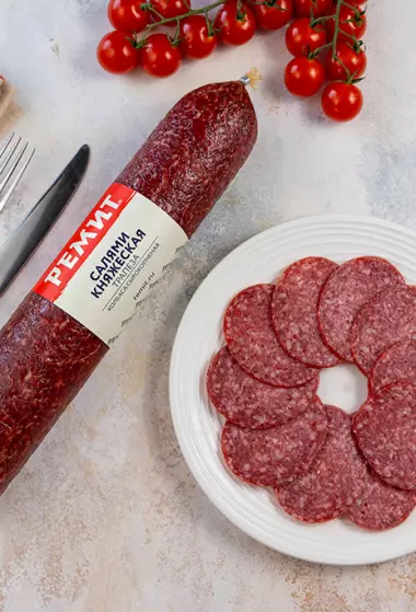 Сервелат сырокопченый Ореховый из нежной свинины и отборного шпика, с насыщенным ореховым ароматом. Классический для сервелата и любимый многими мелкозернистый рисунок среза. Хорош как в мясной нарезке для праздничного стола, так и в качестве изысканного бутерброда на завтрак.