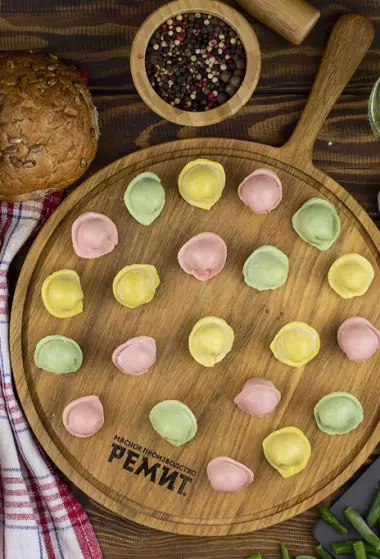 Состав: тесто (мука пшеничная высшего сорта, вода питьевая, меланж яичный пастеризованный, масло растительное подсолнечное рафинированное, соль пищевая, глютен пшеничный, кукурузный крахмал, куркума); фарш (свинина, лук репчатый очищенный, говядина, вода питьевая, кинза резанная свежемороженная, соль пищевая, пряности (перец черный, перец красный, чеснок сушеный, мята сушеная), антиокислители (аскорбат натрия, аскорбилпальмитат), экстракт пряности розмарин. Производится на предприятии, где также используются молоко, горчица, орехи, сельдерей, соя. РЕКОМЕНДАЦИИ ПО ПРИГОТОВЛЕНИЮ: В ЧЕТЫРЕ ЧАСТИ КИПЯЩЕЙ ПОДСОЛЕННОЙ ВОДЫ ЗАСЫПАТЬ ОДНУ ЧАСТЬ ПЕЛЬМЕНЕЙ, ВАРИТЬ, ПОМЕШИВАЯ, НЕ БОЛЕЕ 2-4 МИНУТ.